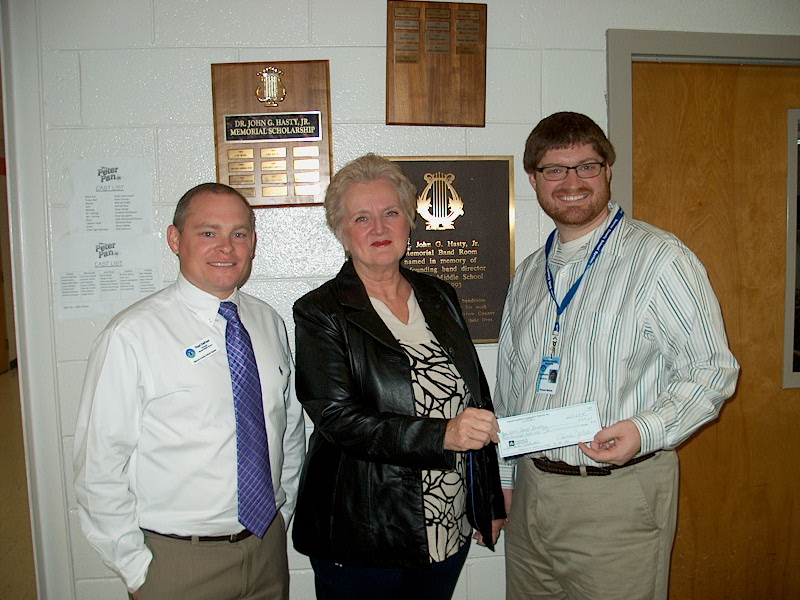 Photo: Left to right: Principal Paul DeFoor, Elinor Hasty, Band Director Christopher McCarver