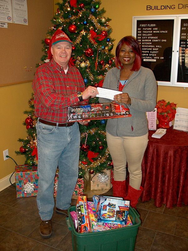 Winder-Barrow Community Theatre recently performed the play "Santa Lives! Yes, Virginia There is a Santa Claus." at the Winder Cultural Arts Center. A part of the proceeds of this play was donated to the Holiday Connection of Barrow County. The photo shows the WBCT President, Tery Overbey, presenting the check along with a box of donated toys to Melinda Shealey. Melinda is the Drop-Out Prevention Specialist with the Family Connection and Community in Schools of Barrow County. The money will be used to purchase needed toys for the Holiday Connection Christmas Store where needy families are allowed to choose gifts for their children.