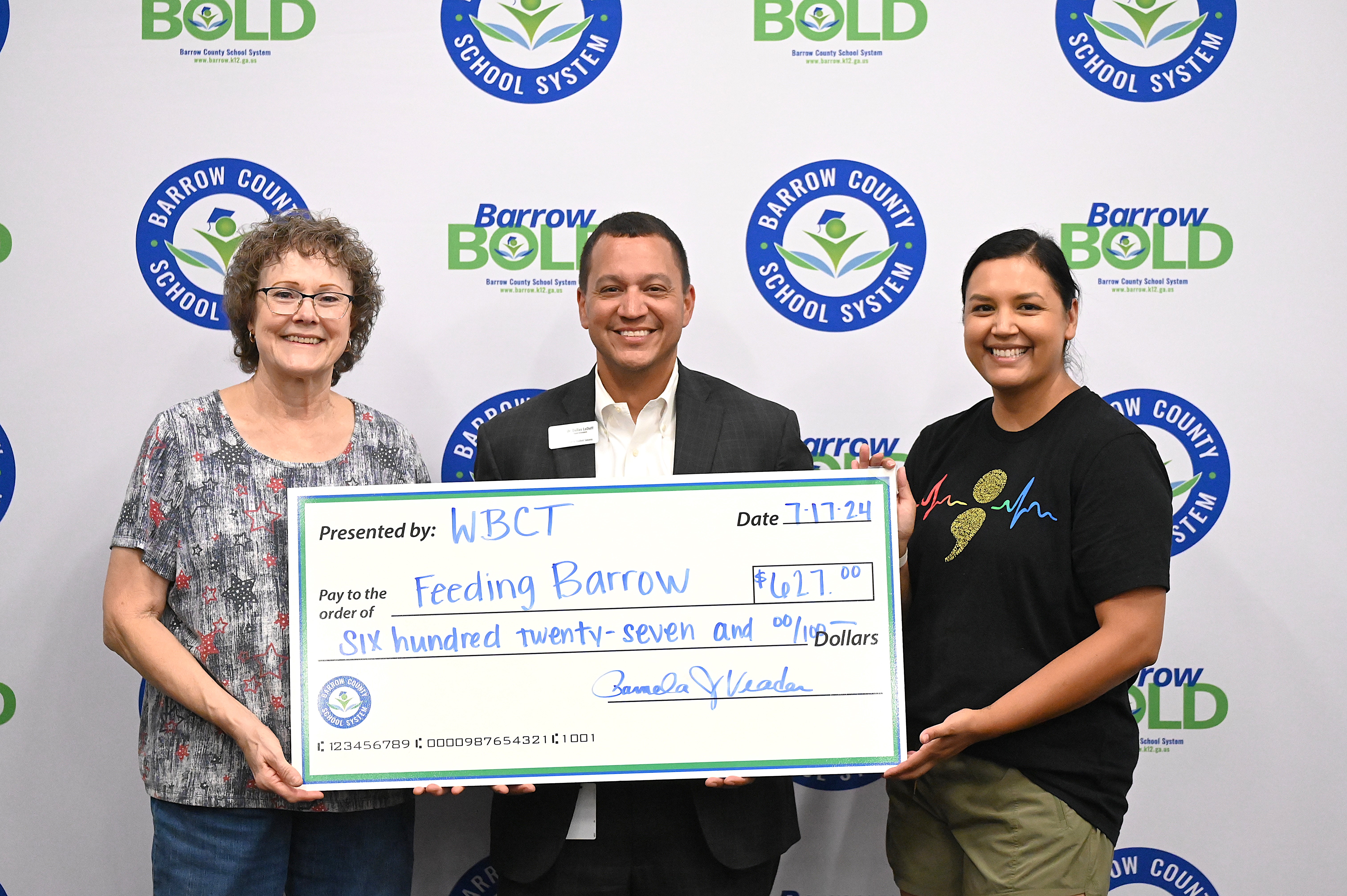 Pictured left to right are Pam Veader, WBCT Treasurer; Superintendent Dr. Dallas LeDuff and Laura Etheridge, BCSS Social Worker & Feeding Barrow Coordinator.