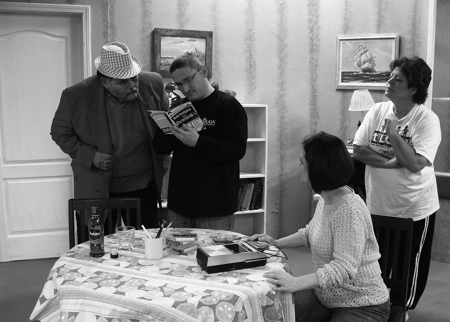 Photo: Joel Lovinggood, Dennis Dorsey, Kristi Torbert, and Sharon Perdue rehearse a scene.