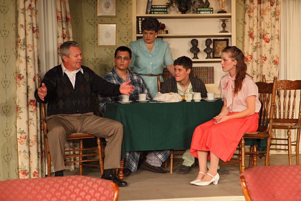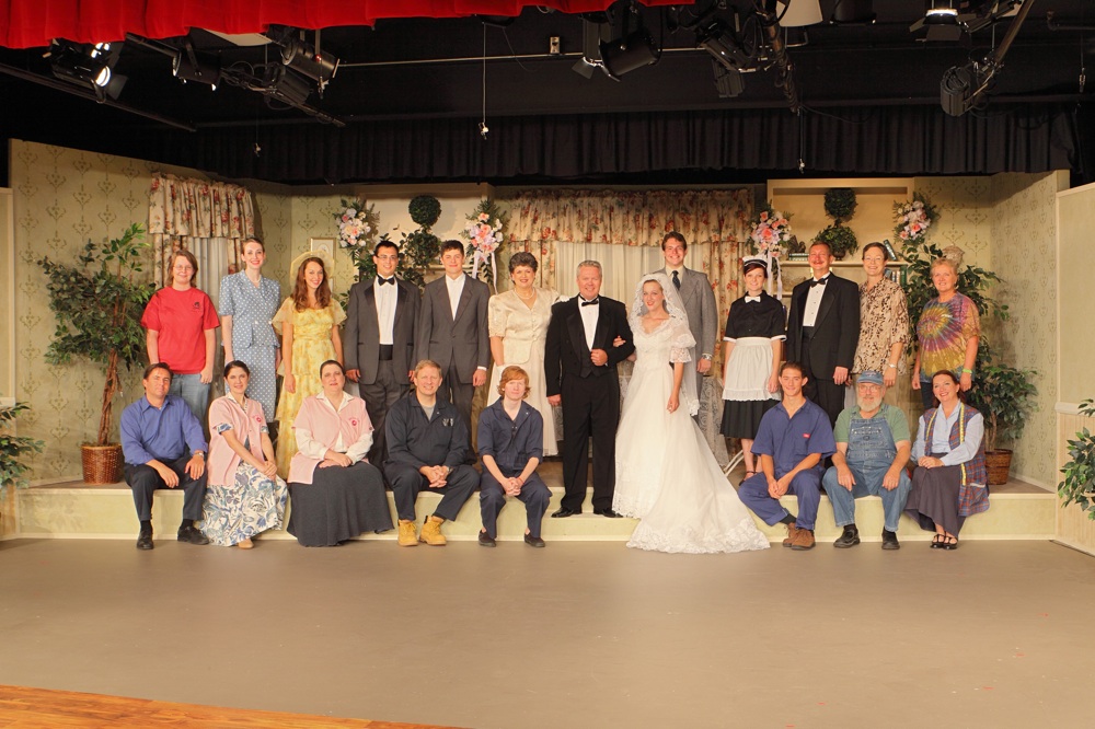 PER DRAMATISTS PLAY SERVICE, THE STORY: Mr. Banks learns that one of the young men he has seen occasionally about the house is about to become his son-in-law. Daughter Kay announces the engagement out of nowhere. Mrs. Banks and her sons are happy, but Mr. Banks is in a dither. The groom-to-be, Buckley Dunstan, appears on the scene and Mr. Banks realizes that the engagement is serious. Buckley and Kay don't want a "big" wedding—just a simple affair with a few friends! We soon learn, however, that the "few" friends idea is out. Then trouble really begins. The guest list grows larger each day, a caterer is called in, florists, furniture movers and dressmakers take over, and the Banks household is soon caught in turmoil—not to mention growing debt. When Kay, in a fit of temper, calls off the wedding, everyone's patience snaps. But all is set right, and the wedding (despite more last-minute crises) comes off beautifully. In the end, the father of the bride is a happy, proud man, glad that the wedding is over, but knowing too that it was worth all the money and aggravation to start his daughter off so handsomely on the road to married life.